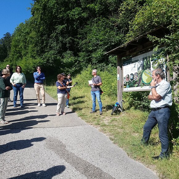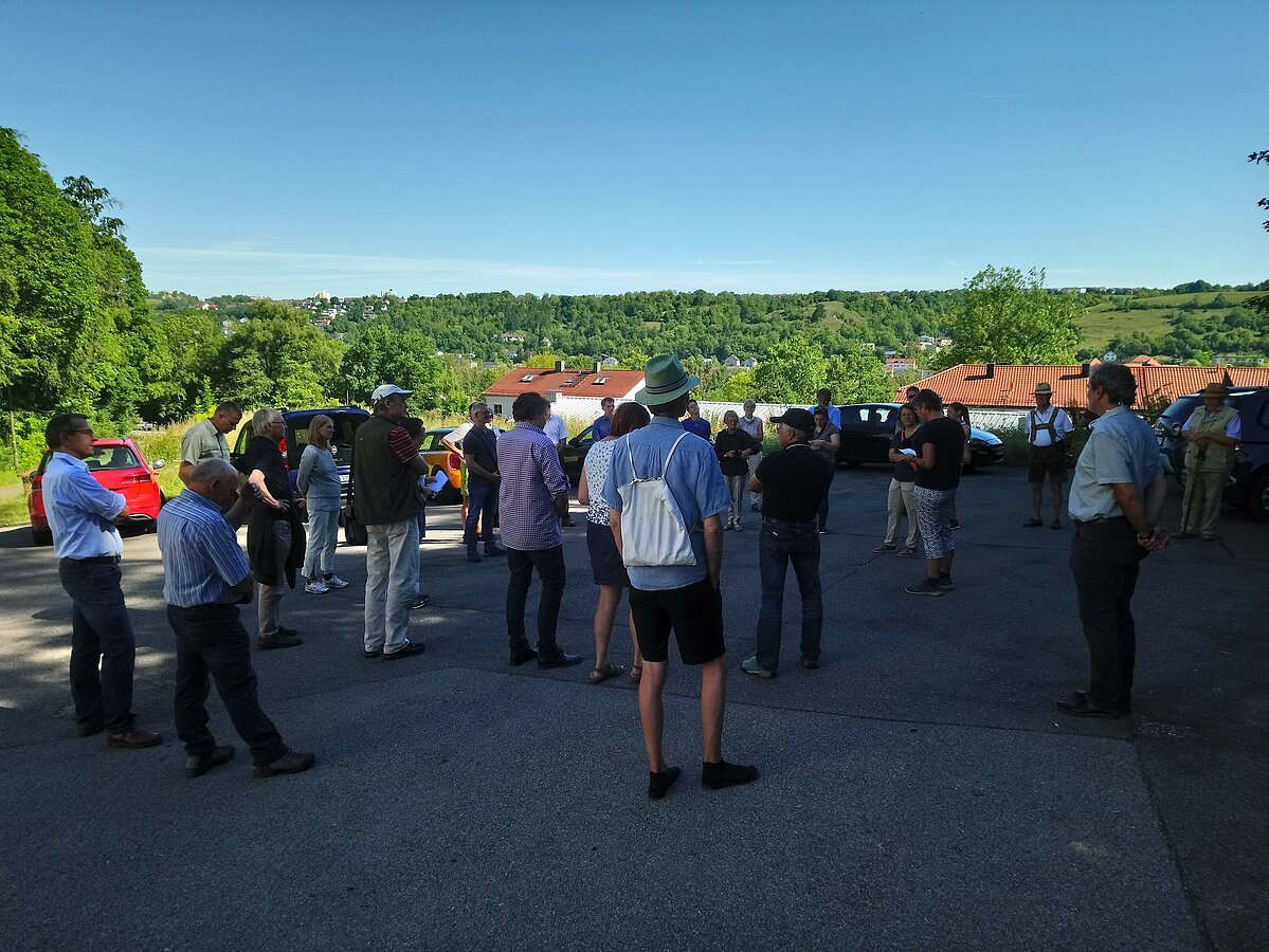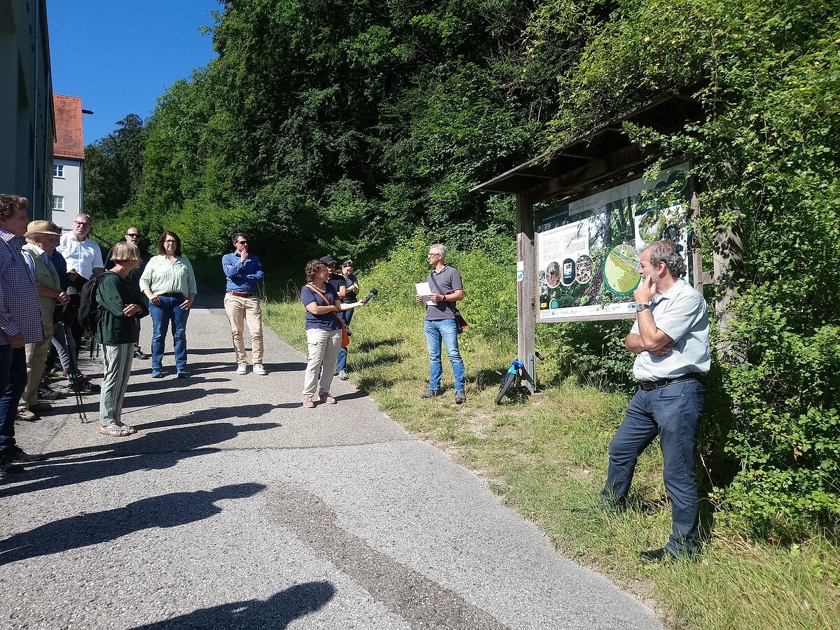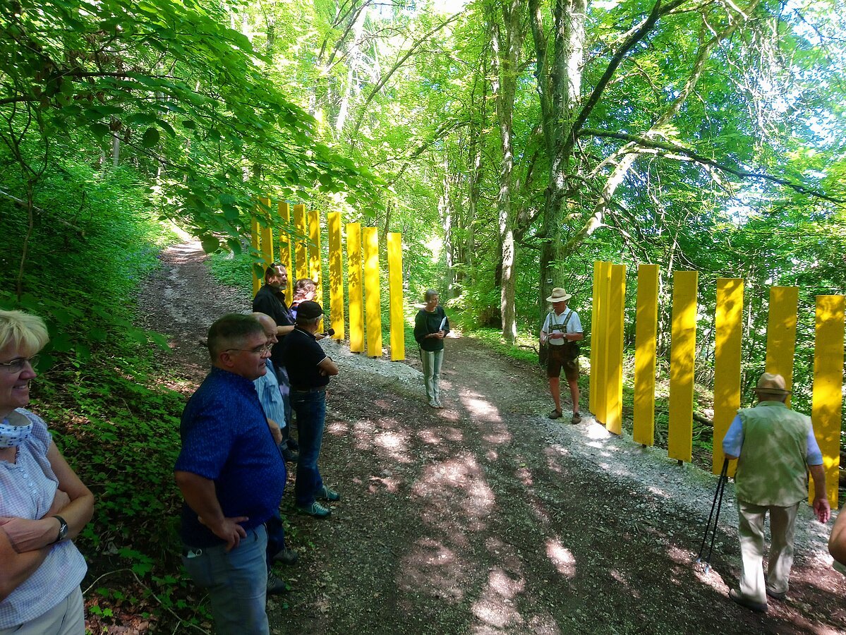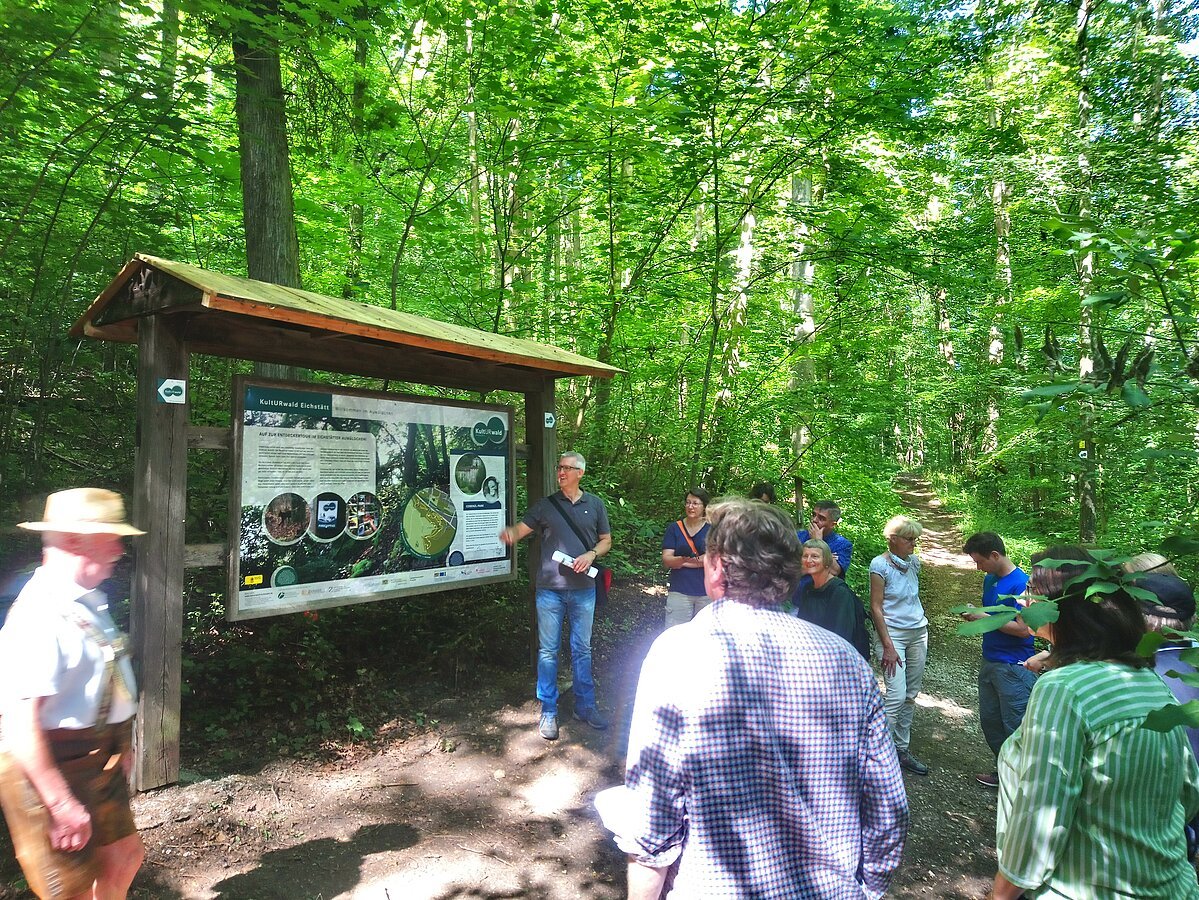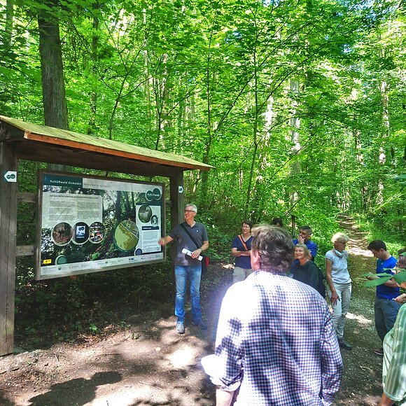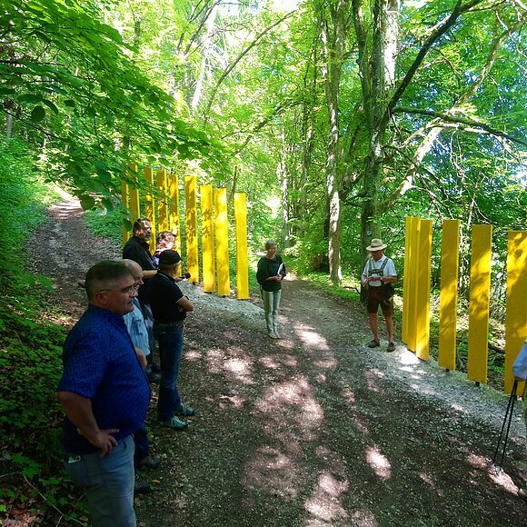 Nach Grußworten von Agnes Stiglmaier, LEADER-Koordinatorin am Amt für Ernährung, Landwirtschaft und Forsten Ingolstadt und LAG-Managerin Lena Deffner ging es in den schattigen Wald, der als willkommene Abkühlung diente. Die Eichstätter Künstlerin Li Portenlänger, die u. a. für die Feinkonzeption und das Verfassen der Texte für die Infotafeln zuständig war, führte die Teilnehmer über den etwa 1,5 km langen Wanderpfad und erläuterte zahlreiche geschichtliche Hintergründe.