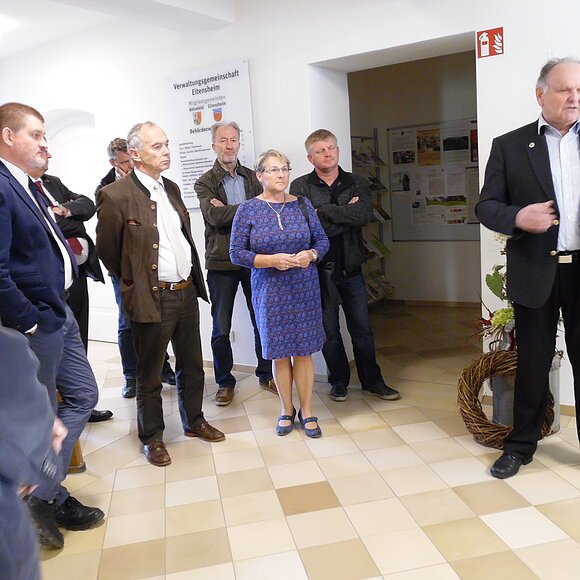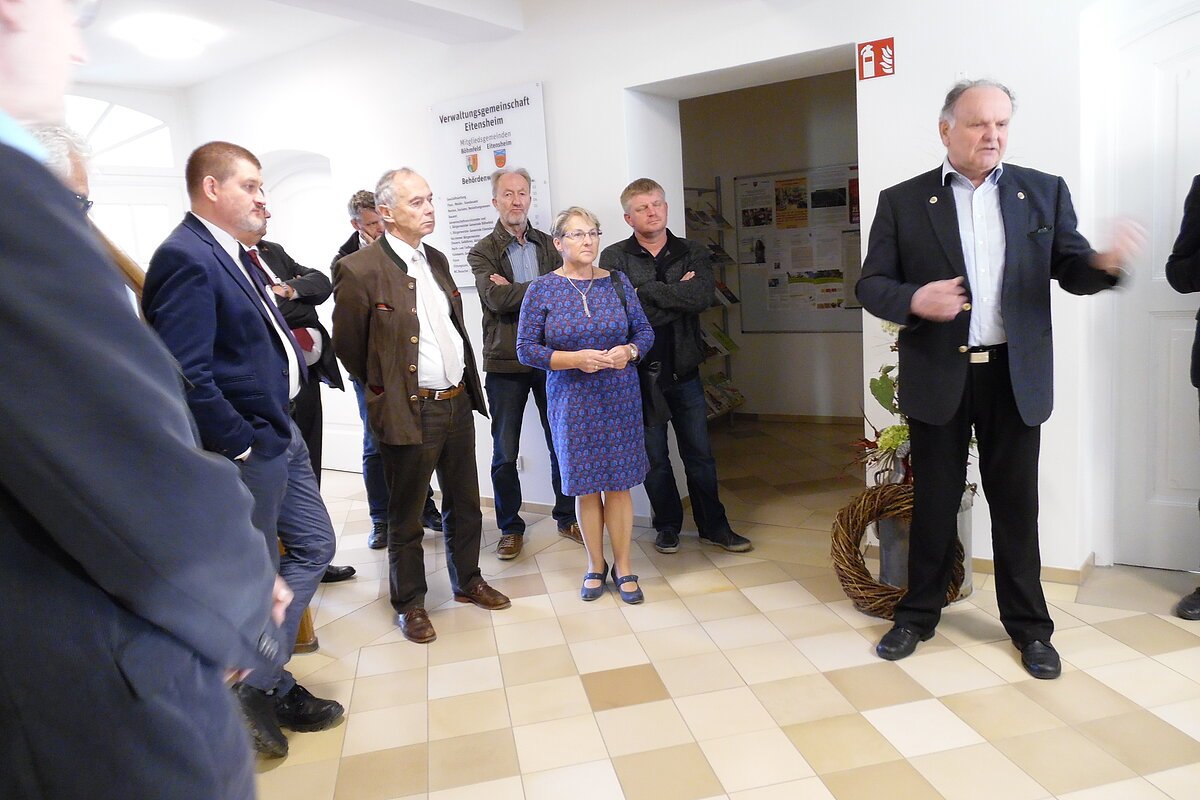Die teilnehmenden Bürgermeister, Gemeinderäte und Verwaltungsmitarbeiter aus nahezu allen LAG-Mitgliedskommunen wurden in zwei Gruppen durch den Carlshof geführt. Architektur-Studentin Franziska Rasch zeigte den Hof und die Außengebäude, Bürgermeister Michael Stampfer führte durch das sanierte und umgebaute Rathaus.