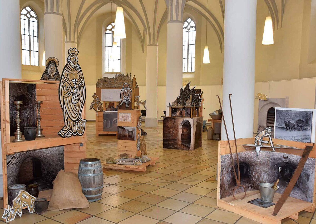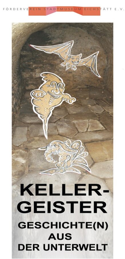 Die Ausstellung "Kellergeister - Schätze aus der Unterwelt" sollte die spannende historische Unterwelt der Stadt Eichstätt ans Licht holen und Besucher*innen vorgestellt werden. Die Kelleranlagen reichen bis ins 14. Jahrhundert zurück, deren verschiedene Facetten der Architektur, Kellerfunktionen und die Atmosphäre mit Fotos und Fundobjekten aufgezeigt wurde.