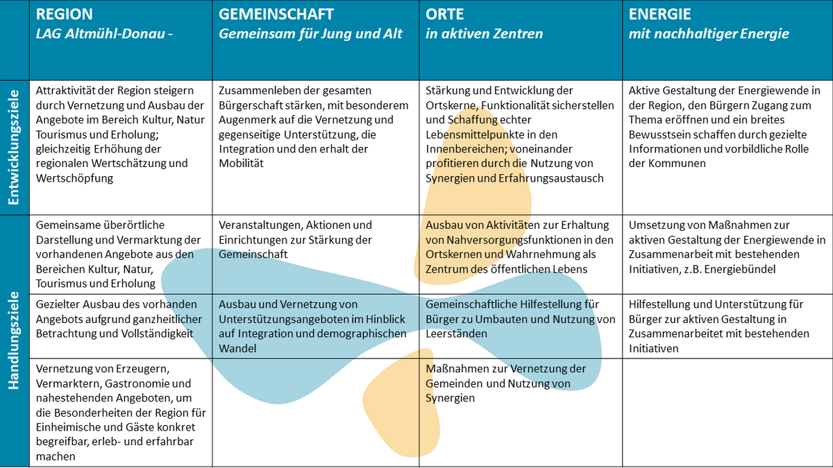 Hauptbestandteil der LES sind die Entwicklungsziele, die unter dem Leitsatz „LAG Altmühl-Donau – Gemeinsam für Jung und Alt in aktiven Zentren mit nachhaltiger Energie“ stehen. Im Zuge der Formulierung der Ziele musste zudem eine Gewichtung vorgenommen werden - d. h. eine prozentuale Verteilung der Fördermittel auf die vier Entwicklungsziele. Diese Festlegung ist jedoch nicht statisch und kann bei Bedarf durch einen Beschluss der Mitgliederversammlung angepasst werden, so erstmals geschehen im Oktober 2018.